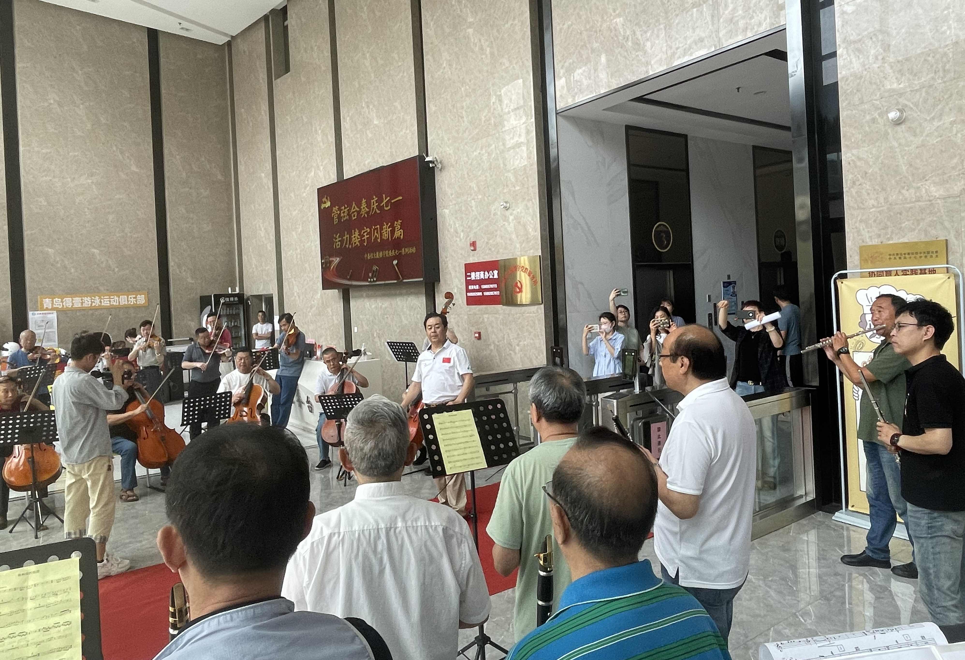 此次快閃活動(dòng),來(lái)自中泰信大廈的企業(yè)職工、周邊社區(qū)居民等200余人共同參與。小提琴、二胡、笛子、薩克斯器樂(lè)組合,分組奏響著《我和我的祖國(guó)》等曲目,樂(lè)手傾情演繹,旋律真摯動(dòng)人,抒情激情結(jié)合,愛(ài)黨愛(ài)國(guó)之情透入心扉!人們不由自主駐足,舉起手機(jī)拍照……